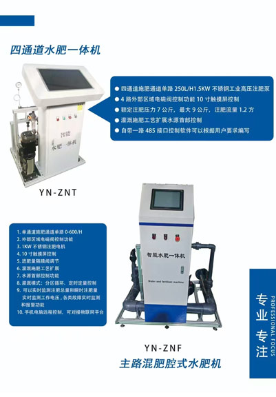 基本功能:单通道施肥,可扩展4通道吸肥1KW不锈钢施肥泵7寸触摸屏控制进肥量隔膜阀调节自动混肥搅拌功能